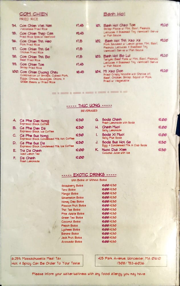 Nestled at 425 Park Ave, Worcester, Dalat Restaurant offers a delightful escape into the vibrant world of Vietnamese cuisine. Known for its extensive noodle and rice dishes, this casual eatery delights every palate, from vegans to meat lovers. Signature dishes like flavorful Pho and crispy egg rolls capture the essence of authentic Vietnamese flavors.